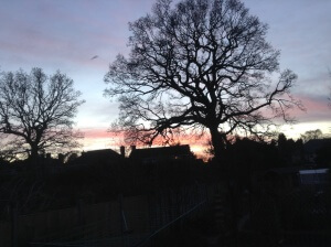 When I woke up during last night, from the window I could see the silhouette of the oak at the bottom of our neighbour’s garden. It loomed as a maze of branches, grey shadows between them.